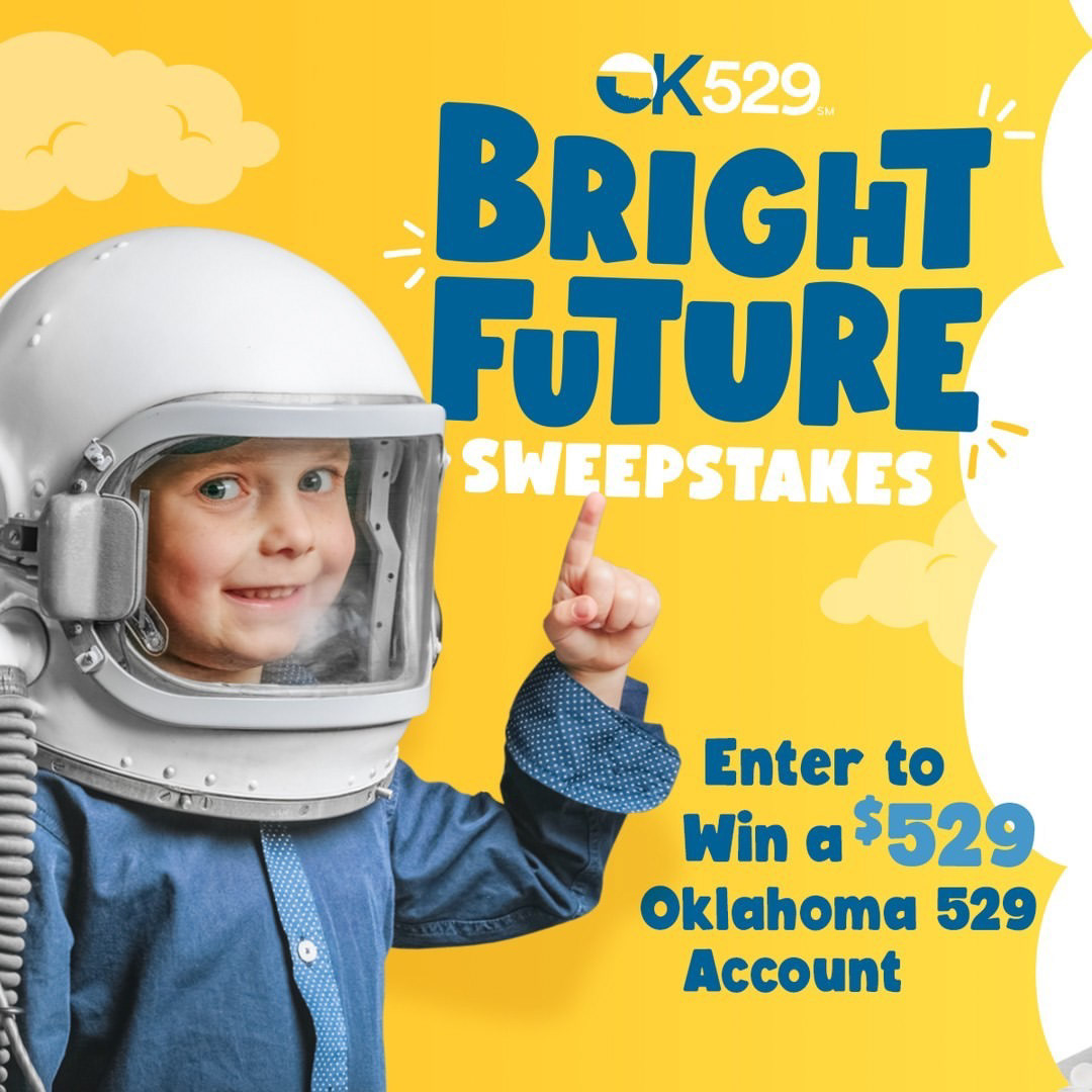 Launch your kiddo’s college savings with a $529 boost from Oklahoma 529. Complete the official entry form at Oklahoma529.com/program/brightfuture